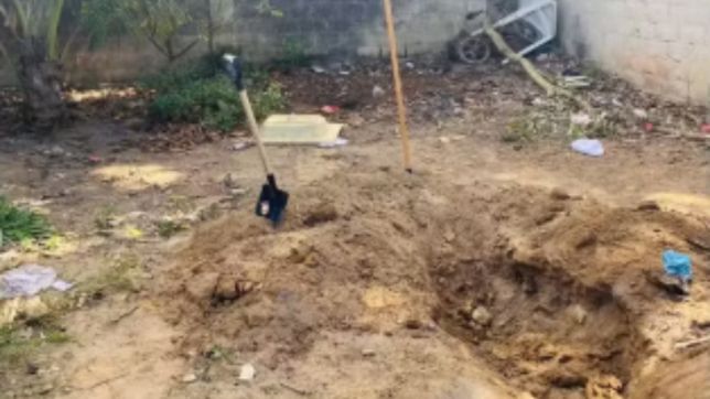 Os policiais visualizaram, encostados ao muro, uma pá e uma enxada aparentemente novas. Diante das suspeitas, a guarnição entrou na residência na tentativa de localizar a vítima, sendo visualizados apenas respingos de cor vermelha próximos ao banheiro.