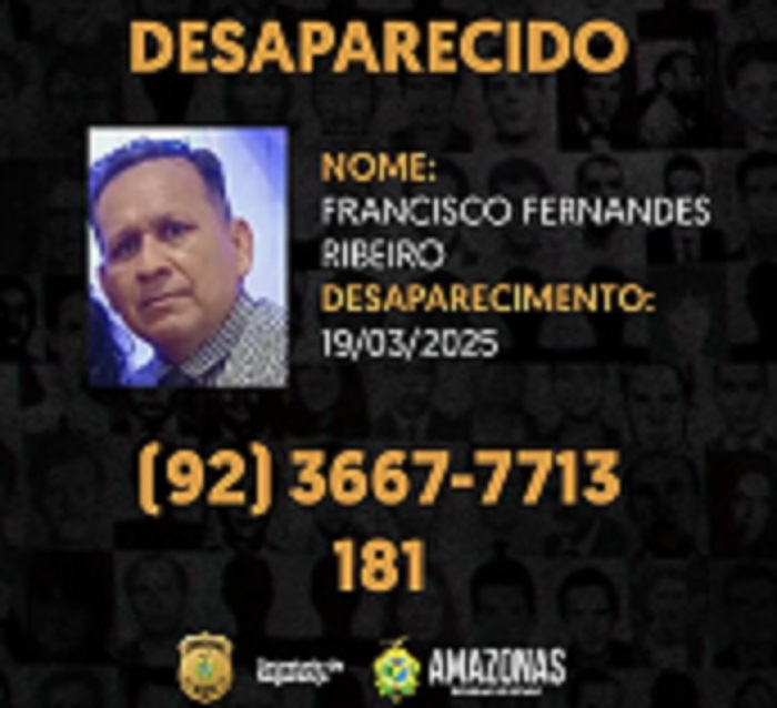 Quem tiver qualquer informação sobre Francisco Fernandes Ribeiro pode repassar através dos números (92) 3667-7713, da Deops ou pelo 181 da Secretaria de Estado de Segurança Pública do Amazonas (SSP-AM).