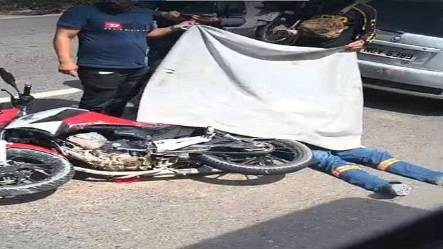 Populares usaram um pano para cobrir o motociclista e protegê-lo do sol forte na manhã desta sexta-feira