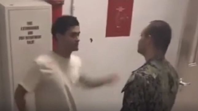 O militar consegue desviar do golpe e reage imediatamente com socos, iniciando uma briga.