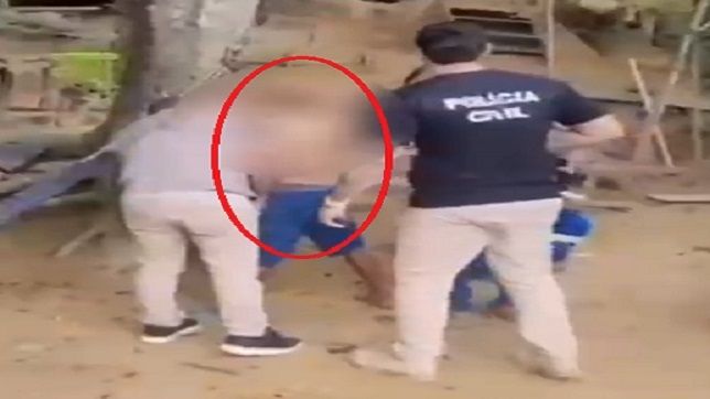 Momento que os policiais chegam e prendem o filho agressivo em flagrante delito no quintal da residência
