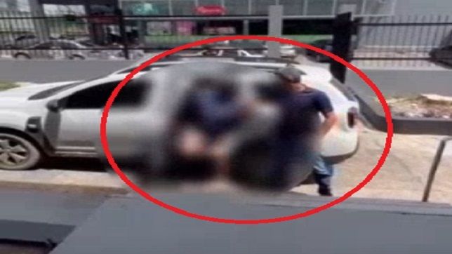 Momento que policial retira o homem preso da viatura da DERFD no bairro da Alvorada