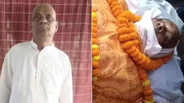 -74-year-old Mohan Lal staged his own funeral in Gaya, lying on a bier in a white shroud.