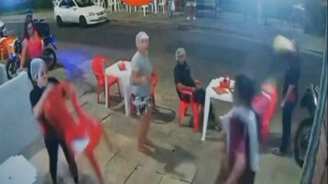 A fruta só não atingiu o rosto da mulher agredida, porque ela foi ágil o bastante para se proteger, fazendo uma cadeira de escudo, quando o homem arremessou o coco com muita força, em sua direção.