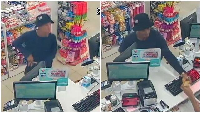 As imagens mostram o bandido, mais uma vez, vestindo camisa preta com mangas e boné preto, coagindo as vítimas, subtraindo nesse crime, um aparelho celular do estabelecimento e R$ 800 em espécie.