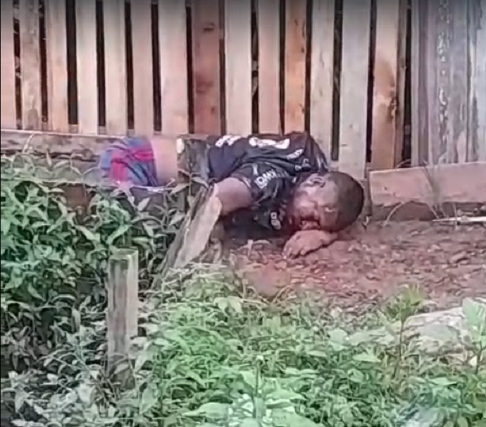 Depois que os agressores foram embora o usuário de drogas ficou jogado no meio da rua, desmaiado, camisa, bermuda ensanguentados e com múltiplos ferimentos na cabeça, outras partes do corpo.
