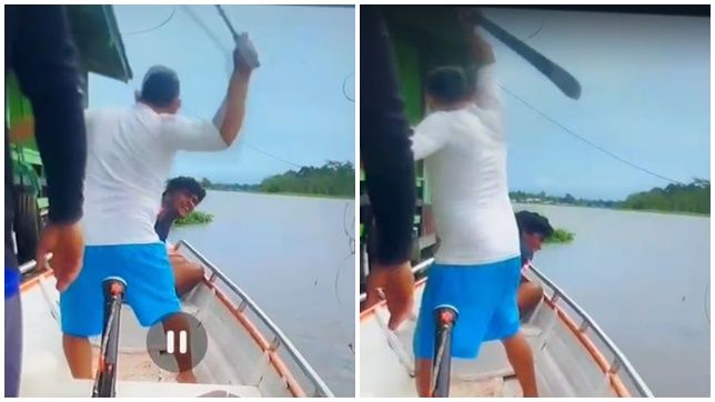 As imagens mostram o indivíduo sentado na proa de uma embarcação e por trás dele, um dos membros do grupo que o capturou, com o terçado na mão e aplicando as violentas lambadas.
