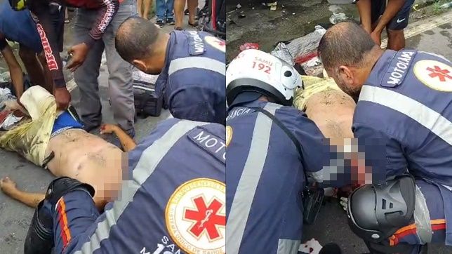 A colisão de motocicleta e carro foi tão violenta que o motociclista, foi arremessado há mais de três metros e caiu em cima da calçada, batendo a cabeça na pista, que provocou muito sangramento.