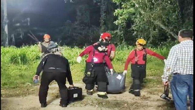 Equipe do Corpo de Bombeiros Militar sai da área de mata com o corpo do homem brutalmente assassinado