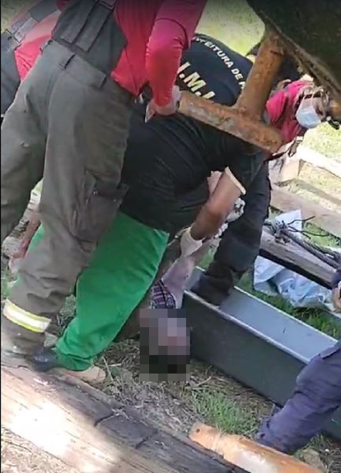 Equipes de bombeiros e do IML removeram o cadáver do local onde foi encontrado no final da tarde