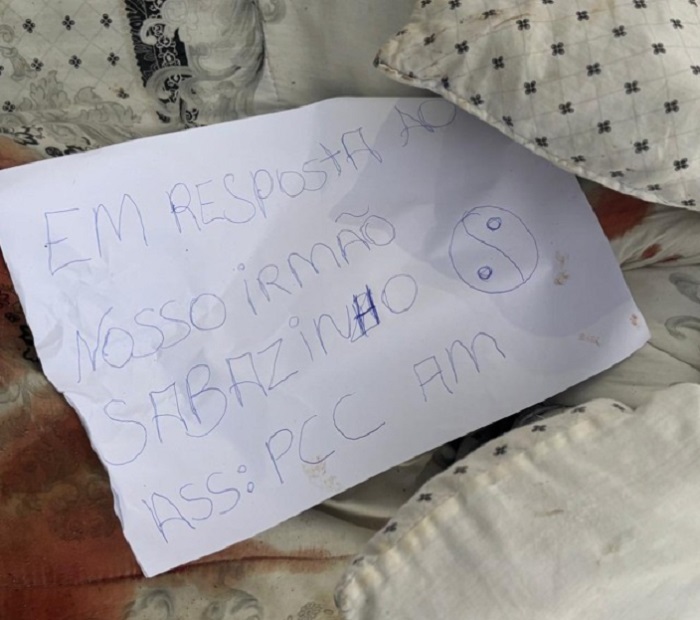 No bilhete estava escrita a seguinte frase com letras maiúsculas: “EM RESPOSTA AO NOSSO IRMÃO SABAZINHO. ASS: PCC AM", deixando evidenciado que foi uma vingança com requintes de extrema brutalidade cometido por um tribunal do crime formado por traficantes da facção criminosa Primeiro Comando da Capital.