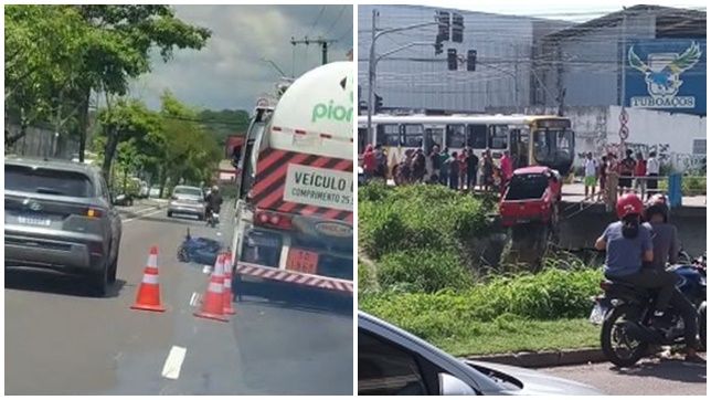O primeiro acidente ocorreu na avenida Efigênio Salles, no bairro Aleixo, Zona Centro-Sul da capital, quando uma motocicleta modelo Yamaha Fazer colidiu com um carro Hyundai Creta, conduzido por uma empresária.