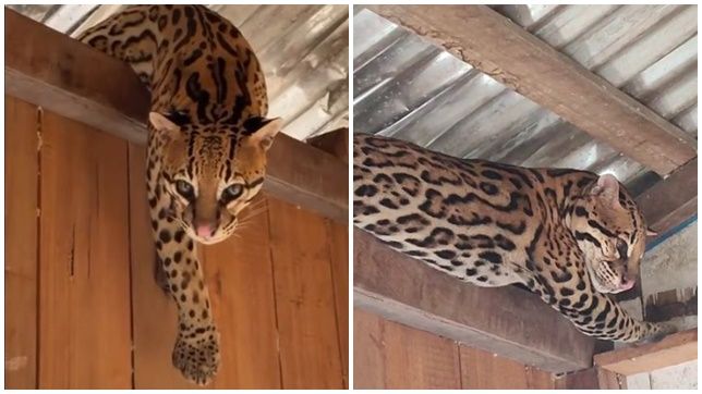 Dois vídeos produzidos por moradores de uma área de alagação na zona rural do município de Carauari, distante 790 quilômetros de Manaus, mostram um felino da espécie Jaguatirica, macho, preso em um pequeno espaço aberto entre a parede e o telhado de uma casa flutuante.