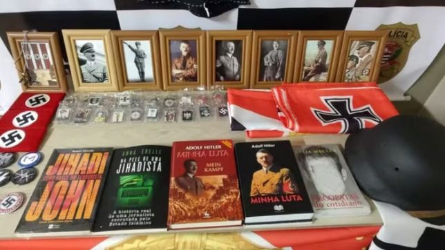 Ele era investigado desde 2024 pela Polícia Civil. Durante o cumprimento de mandados de busca e apreensão na casa do suspeito, foram encontrados diversos itens de apologia ao nazismo, como braçadeiras, correntes, chaveiros e broches — além de duas edições do Minha Luta, livro autobiográfico de Adolf Hitler usado para a disseminação de ideias antissemitas.
