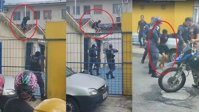 Depois que o bandido desceu do telhado, foi devidamente algemado e apresentado no 6º DIP para os procedimentos cabíveis.