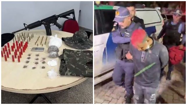 Fuzil, drogas, munições e o pistoleiro preso juntamente com a mulher do líder da facção criminosa que fugiu do local