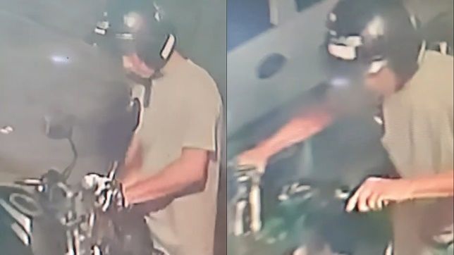 A câmera de segurança filmou o criminoso, que aparece sozinho, chegando e indo embora com a motocicleta.
