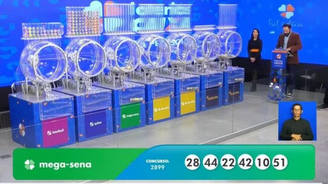 A Caixa Econômica Federal realizou, neste sábado, o sorteio do concurso 2.899 da Mega-Sena, com prêmio estimado em R$ 9.388.148,01. As dezenas sorteadas foram: 10 - 22 - 28 - 42 - 44 - 51.