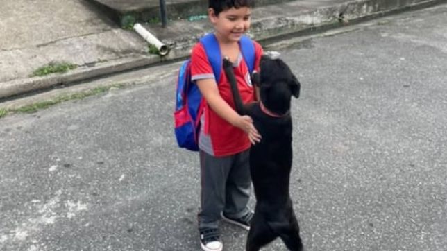 Quando ia para a escola, João reencontrou o vira-lata Pretinho, que estava desaparecido há dois meses; assista ao reencontro cheio de afeto