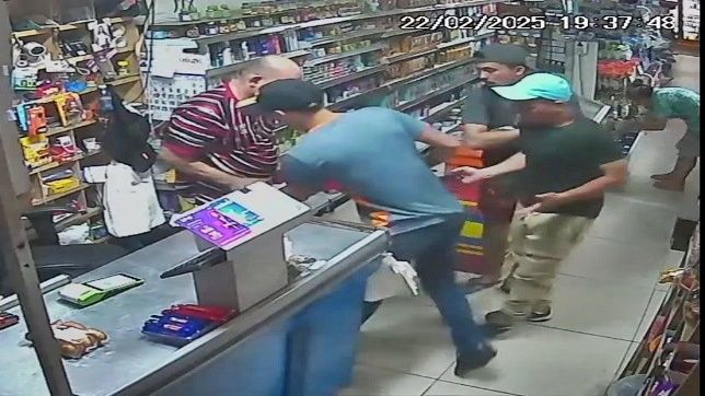 O dono do mercadinho é revistado por um dos assaltantes e clientes também não reagem diante do momento de perigo