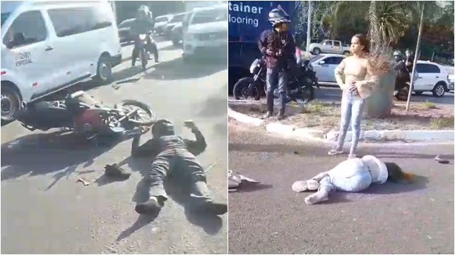 As duas vítimas trafegavam na motocicleta e foram arremessadas bruscamente na pista, como mostram as imagens de vídeos divulgados nas redes sociais.