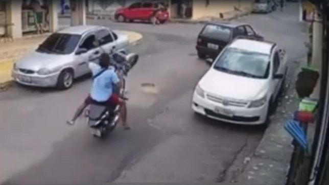 Momento que o motoqueiro, sem capacete, empina a roda dianteira da motocicleta em plena via pública