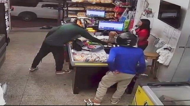 Um homem que estava com as duas filhas, ainda crianças, fazendo compras no estabelecimento, também teve o celular roubado pelos dois homens, um deles armado com uma pistola.