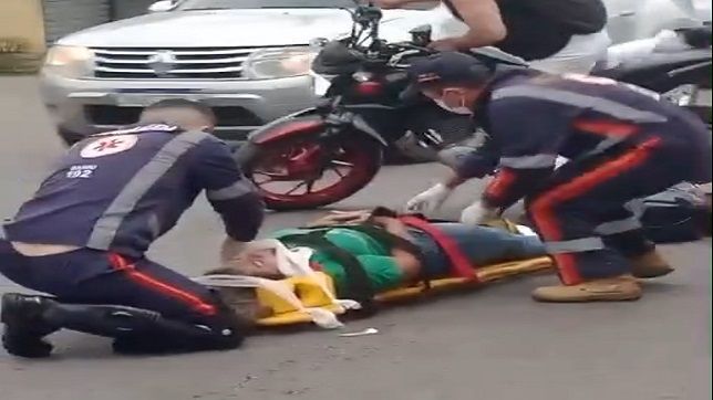 Agentes da equipe do Samu socorrem a mulher atingida violentamente pela motocicleta na manhã desta sexta-feira