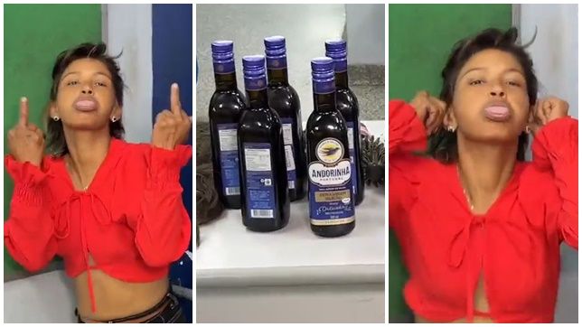 Apesar de estar presa para ser autuada em flagrante delito por crime de furto e sua situação dentro da Delegacia de Polícia não ser nada boa, a mulher ainda sorria, dava língua e fazia atos obscenos com as mãos o tempo todo para os policiais e vigilantes que prenderam no supermercado.