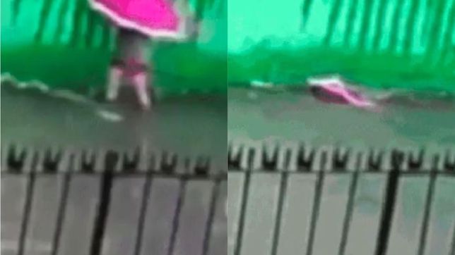 Imagens de uma câmera de segurança registraram o momento exato em que a mulher desaparece na galeria, às 9h14, e reaparece às 9h17, lutando para sair da água.