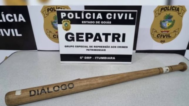 Duas mulheres foram presas em flagrante suspeitas de roubar um caminhoneiro usando um taco de beisebol, em Itumbiara, no sul goiano. O crime aconteceu em um posto de combustíveis, onde a vítima havia parado para descansar. O objeto usado, curiosamente, tem a palavra “diálogo” escrita em letras grandes.