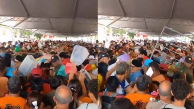 Antes mesmo do início da distribuição, uma multidão impaciente invadiu o espaço reservado, derrubando grades de proteção e se aglomerando em busca de uma fatia.