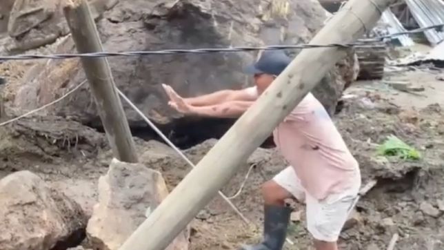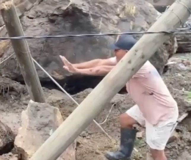 As imagens mostram como os vizinhos, policiais da Polícia Nacional Peruana (PNP), motoristas e trabalhadores tentaram soltá-la usando pás, madeira e arame para mover a pedra, porém, devido ao seu peso, não conseguiram.
