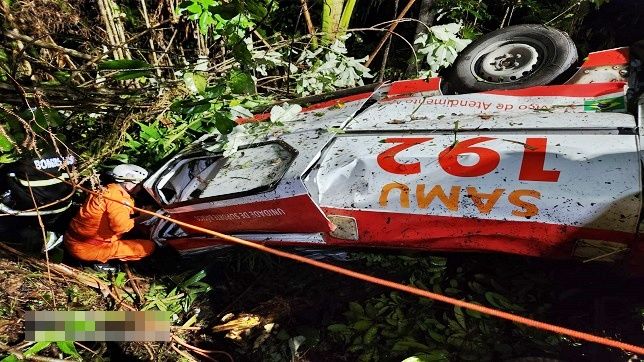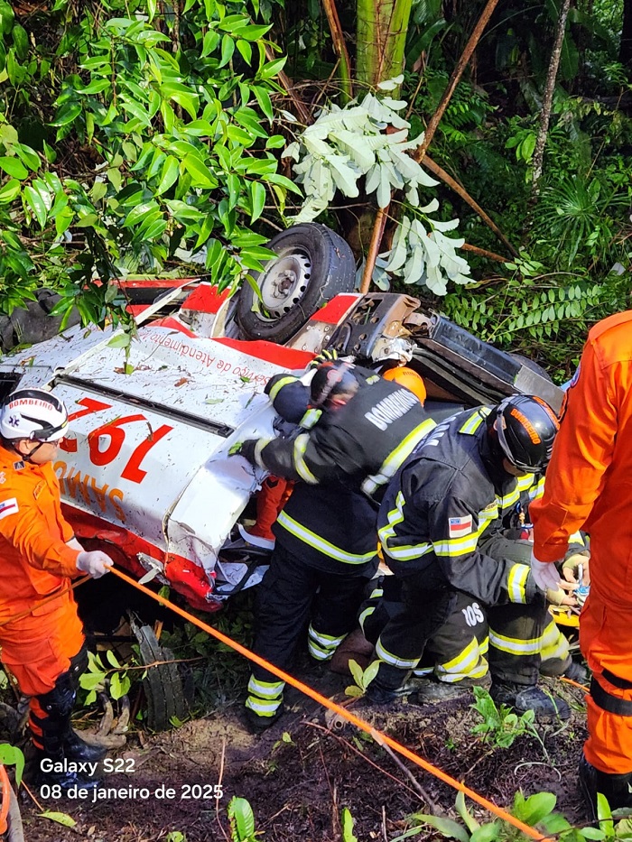 Ambulância capotou na pista e caiu em um barranco à margem da rodovia no começo da manhã de hoje