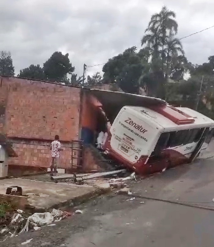 Um ônibus da Empresa Zenatur, que faz rota de transporte de funcionários do Distrito Industrial, ficou sem freios, o motorista perdeu o controle da direção na subida da ladeira, desceu de ré e colidiu com uma residência.
