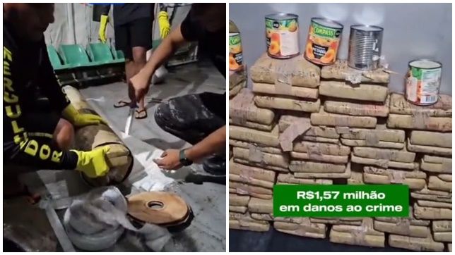 Os tabletes de entorpecentes foram encontrados em tubos de PVC e latas de frutas em calda.