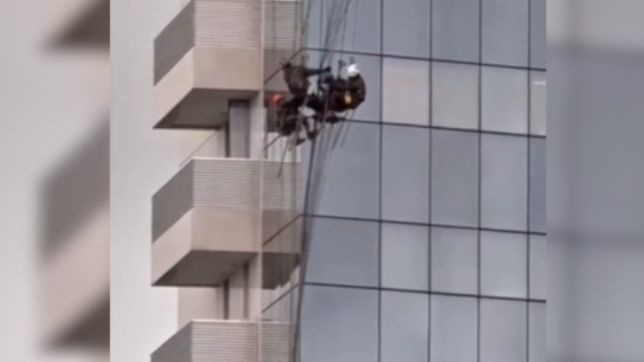Ventos intensos e chuva forte dificultaram a situação, enquanto os trabalhadores permaneciam suspensos pelos cabos de segurança conectados à estrutura.