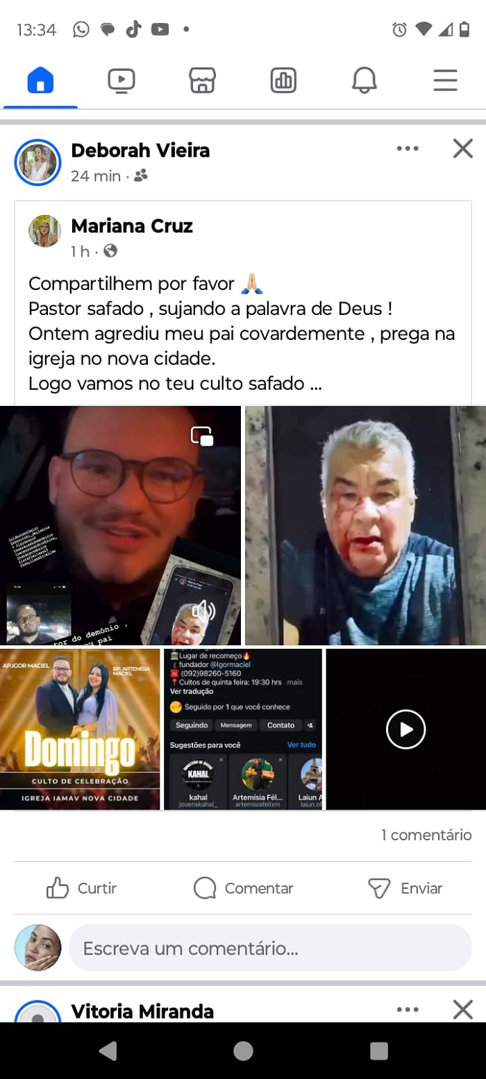 O pastor evangélico identificado como Igor Maciel, está sendo acusado de discutir e depois agredir fisicamente o idoso, Hideraldo Beline Silva, 65, na frente de sua residência, localizada na Avenida Margarita, bairro da nova Cidade, Zona Norte de Manaus.