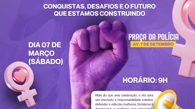 Com o tema “Conquistas, desafios e o futuro que estamos construindo”, a atividade será um espaço de diálogo, reflexão e mobilização sobre os direitos das mulheres, destacando avanços históricos, os desafios ainda presentes na sociedade e a importância da participação feminina na política e na construção de políticas públicas.