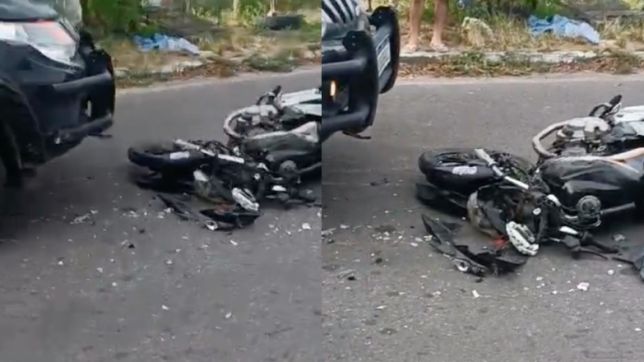 Durante a tentativa de escapar da abordagem, o motociclista perdeu o controle do veículo e bateu de frente com um carro que trafegava na via. Com o impacto, tanto o condutor quanto a mulher que estava na garupa foram arremessados ao chão.