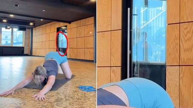 Uma personal trainer que estava gravando um tutorial de exercício para uma cliente flagrou o momento em que um homem, atrás de uma porta de vidro academia em Viena (Áustria), a filmou por trás.