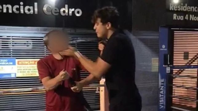 As imagens mostram ainda outro jovem posicionado na porta de entrada do condomínio, impedindo que a vítima entre no prédio onde mora. A confusão só termina com a chegada de sirenes policiais, cuja aproximação é comemorada por Pedro Arthur.
