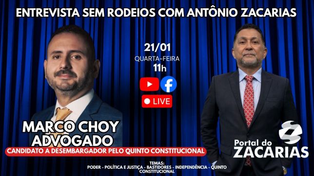 O empresário e jornalista Antônio Zacarias entrevista, na manhã desta quarta-feira (21), o advogado Marco Aurélio Choy, que atualmente está em destaque como candidato à vaga de desembargador pelo Quinto Constitucional no Tribunal de Justiça do Amazonas (TJ-AM).