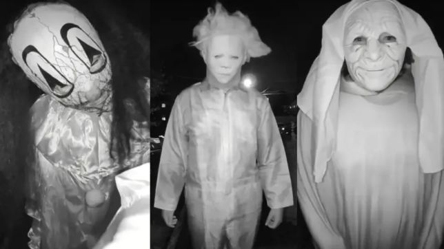 Cena de filme de terror: Trio fantasiado de halloween invade casa e ameaça família