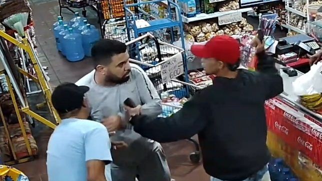 Momento em que o proprietário do mercadinho é rendido e assaltado pelos dois criminosos