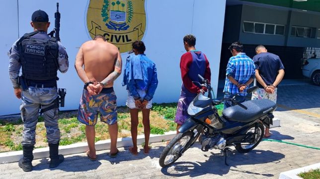A Polícia Militar do Piauí prendeu cinco pessoas, integrantes de facção criminosa, suspeitas de terem praticado crime de extorsão contra um homem na cidade de Parnaíba, litoral do Piauí. Na ocorrência, a vítima foi agredida violentamente com pedaços de madeira e teve a motocicleta roubada.