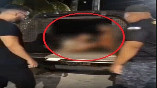 Momento que o homem é retirado do xadrez da viatura policial na frente da DIP do município
