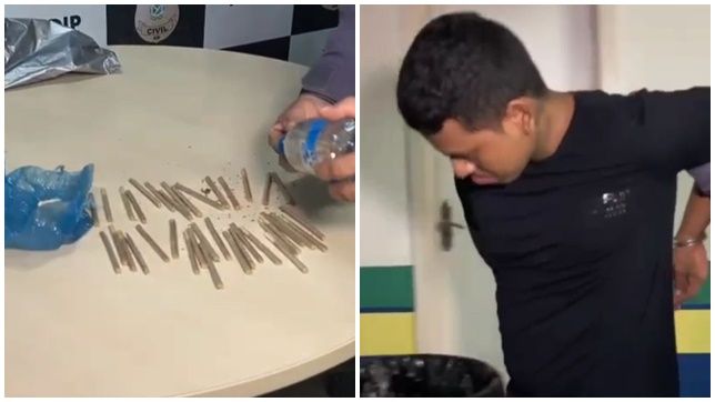 Droga apreendida e o homem que estava fazendo tráfico sendo preso e apresentado no 1º DIP