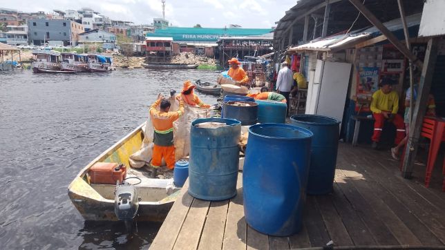 Essas estruturas funcionam como pontos seguros de descarte temporário, onde o lixo fica protegido da maré e de animais até a chegada das balsas, evitando que vá parar nos rios que abastecem Manaus.