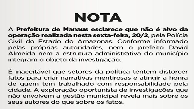 A Prefeitura de Manaus se manifestou, por meio de nota divulgada na manhã desta sexta-feira (20), informando que não é alvo da operação realizada pela Polícia Civil do Amazonas.